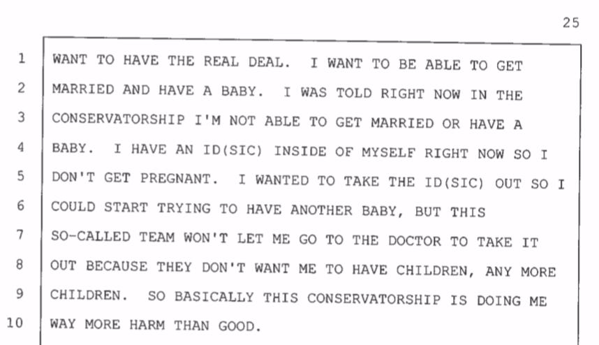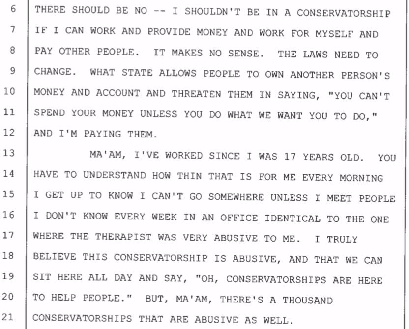 My client is free to discuss any aspect of the conservatorship that she wishes, and is welcome to say whatever she likes. For the record, I would like to state that I have not in any way attempted to control or filter or edit anything that she has to say today. These are entirely her words.