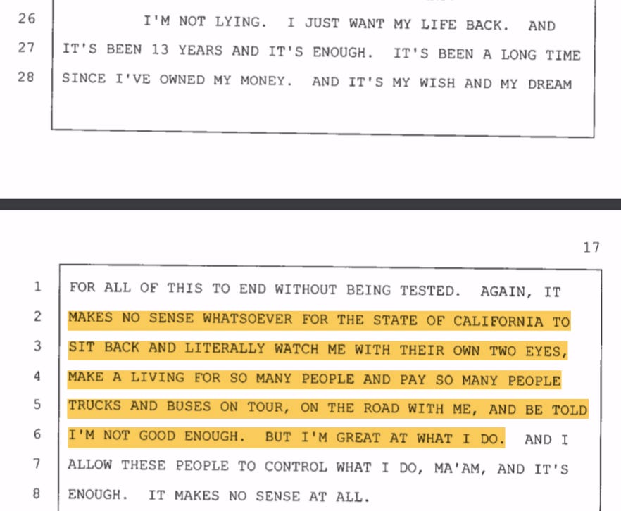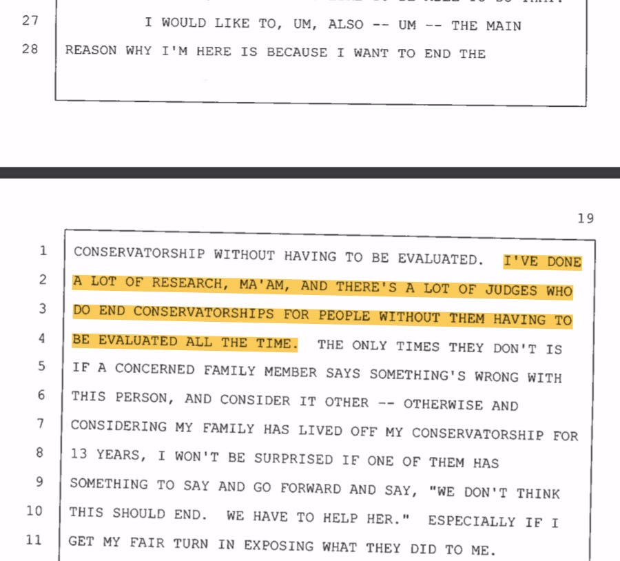 I’m not sure how you make your decisions, ma’am, but this is the only chance for me to talk to you for a while. I need your — your help. So if you can just kinda let me know where your head is. I don’t really honestly know what to say, but my requests are just to end the conservatorship without being evaluated. I want to petition basically to end the conservatorship, but I wanna — I want it to be — petition to end it, but I don’t want to be evaluated, to be sat down in a room with people four hours a day like they did [to] me before, and they made it even worse for me after that happened.