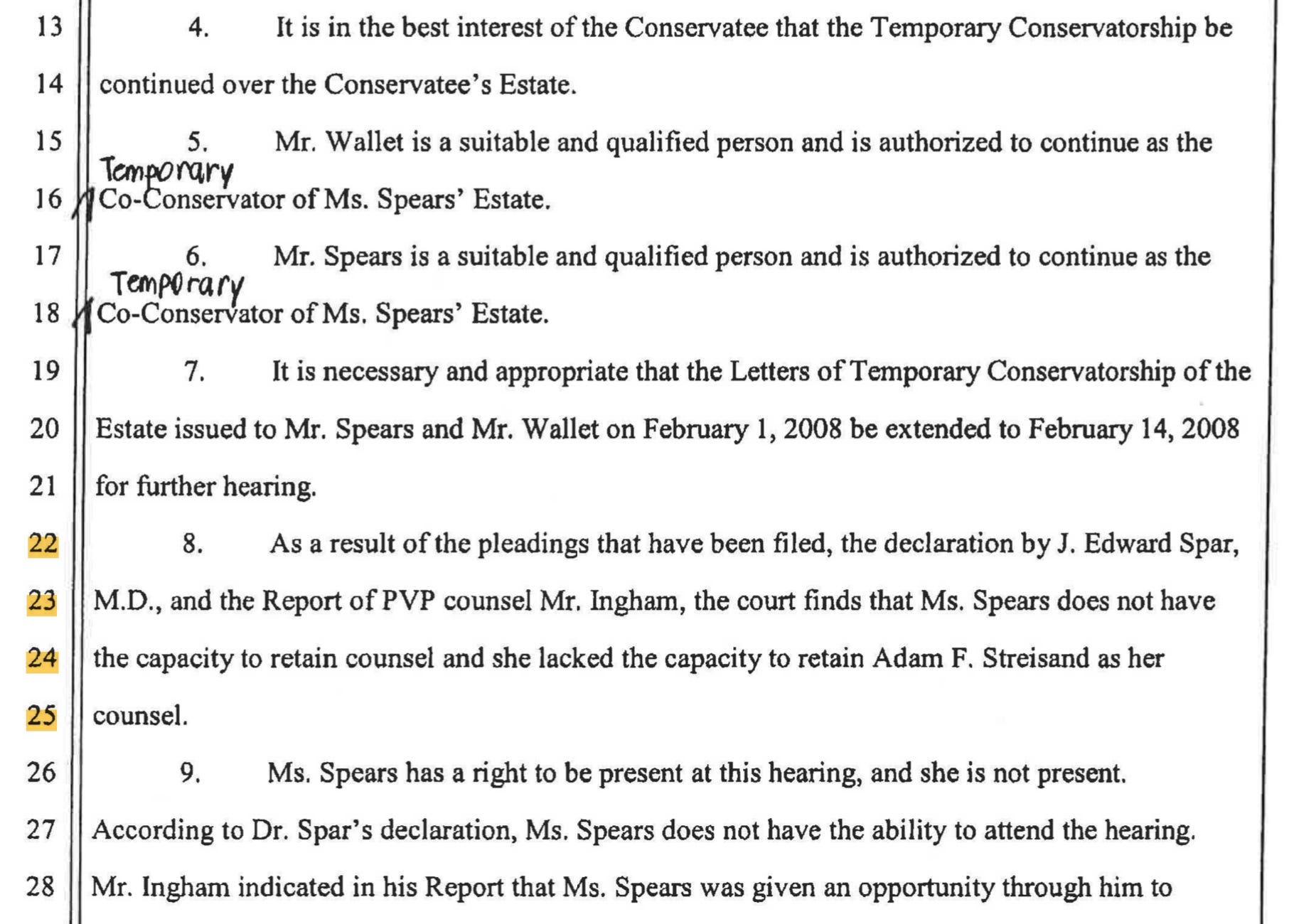 An order of the court on February 6, 2008 (see Exhibit 1 at link) signed by Reva Goetz, the Judge Pro Tempore who previously oversaw the conservatorship, made this finding based on a declaration of a Dr. J. Edward Spar, but that declaration has never been unsealed or made public. The same declaration, according to Judge Goetz, said that Spears did not have the ability to attend a court hearing—a conclusion that seems to have been overtaken by events.
