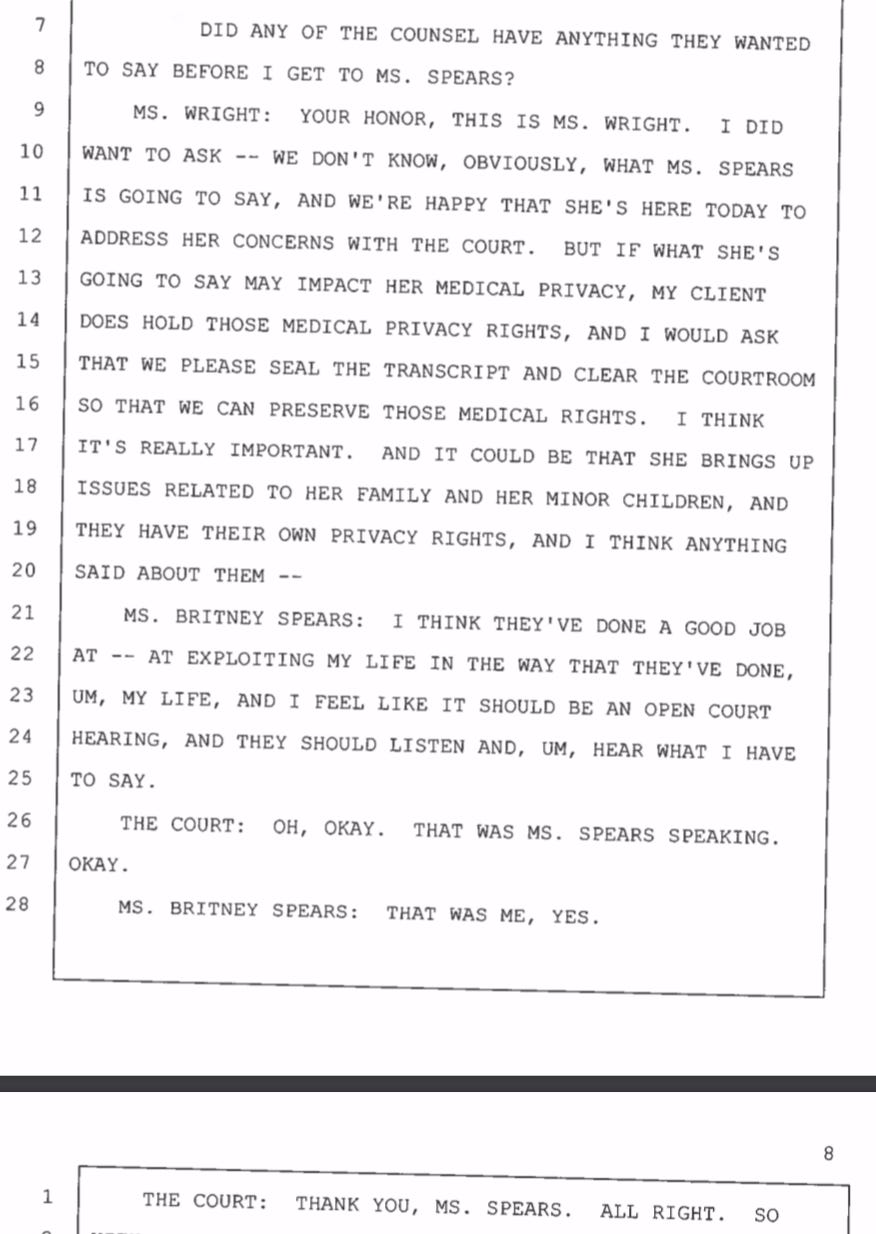 According to the official transcript1 of the June 23rd hearing, Spears said to the judge: